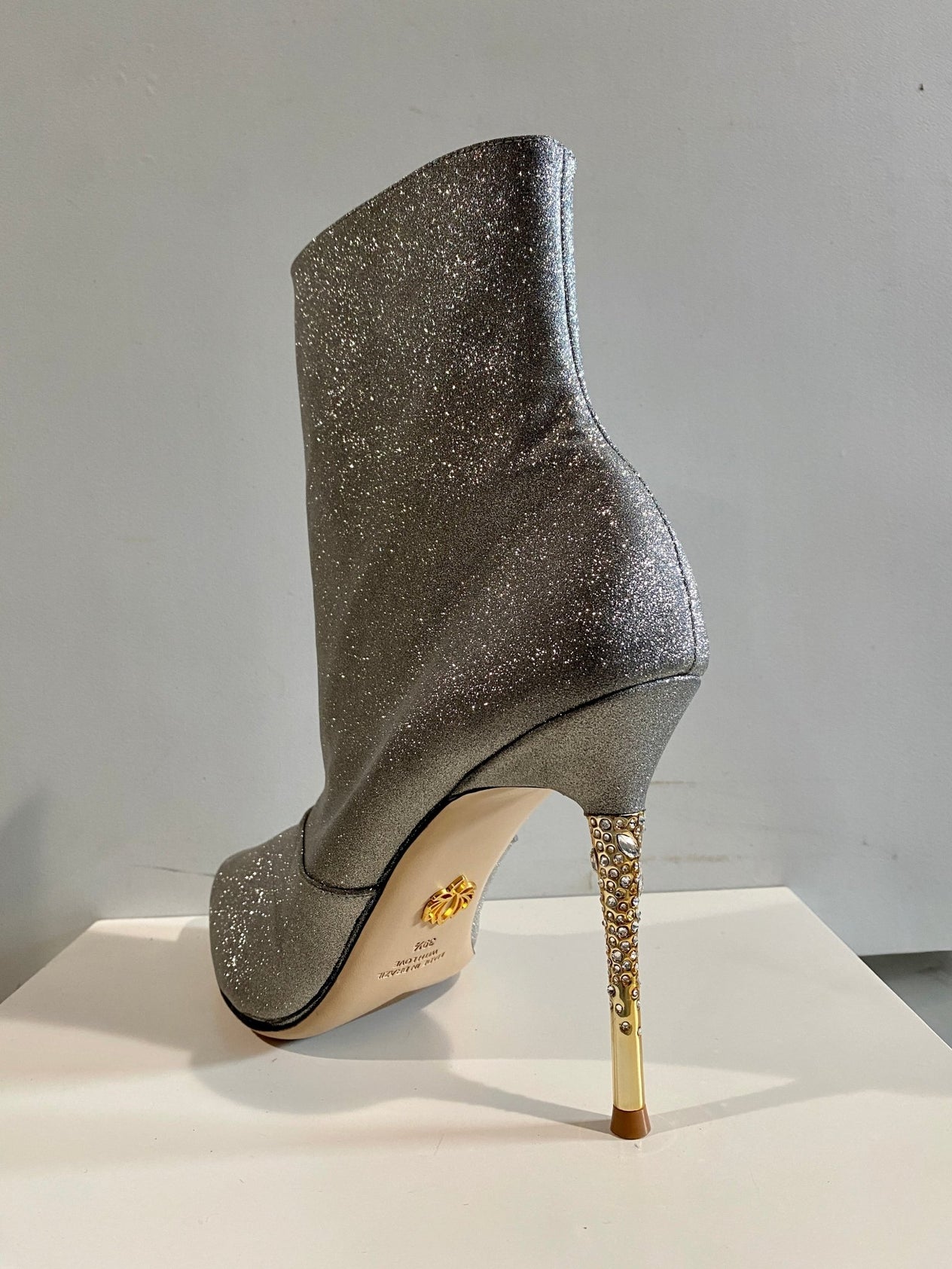 This classic bootie silhouette is updated with an opulent heel featuring clusters of Swarovski crystals that glitter while you walk with confidence & conviction. A rubber pod is recessed into the outsole to prevent slips.