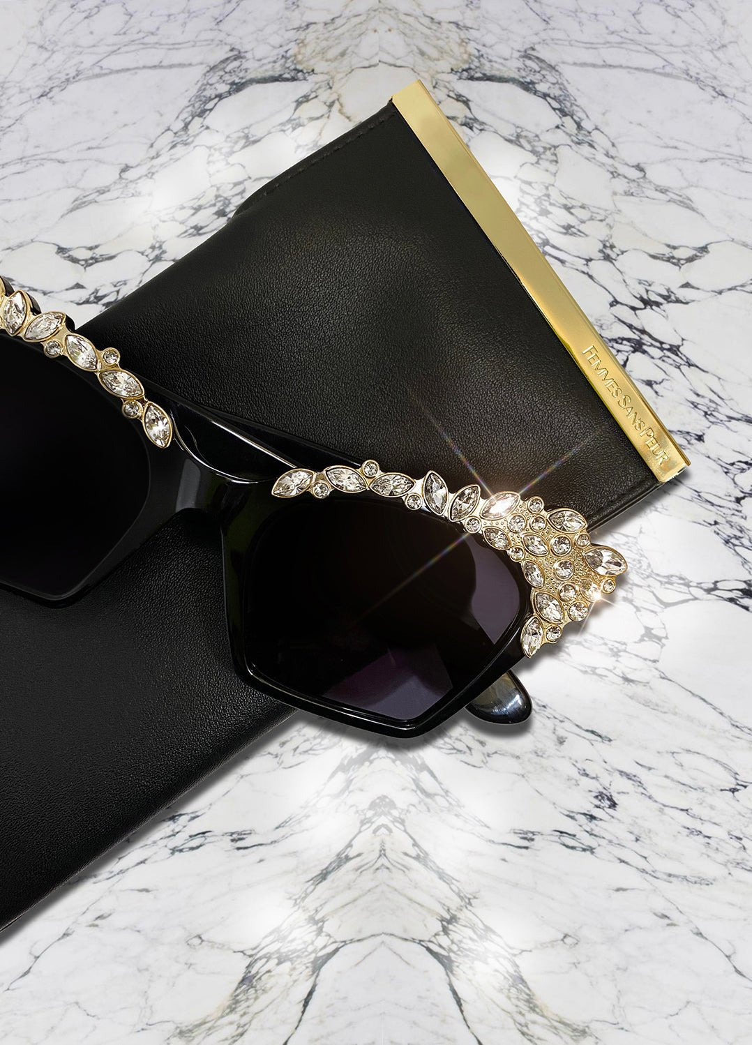 Have all heads turning in these sparkling sunglasses that will take you from sun filled days to gorgeous evening sunsets. Lending a nod to the vintage cat eye with a contemporary squared design, her acetate frames are embellished with sixty genuine Swarovski crystals encased in gold metal that will have you glittering from every angle. Our Femmes Sans Peur logo is inlaid in rich gold mirror lettering on her arms and her lenses are a 100% UVA / UVB protected. Oh, did we mention she comes with a chic faux leather pouch with a magnetic closure that will fit in most handbags and clutches too!