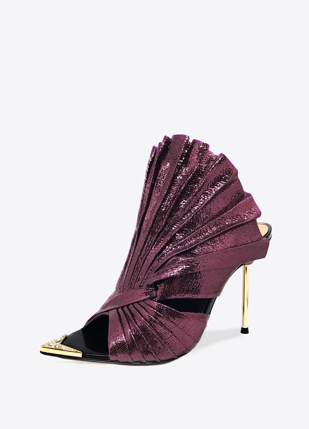 Pleated Silver metallic lizard leather is sculpted to create a scalloped fan effect, setting the perfect stage for the wearer to walk with conviction in this all heads turning mule. The metal toe rand features inlaid Swarovski crystals that will have her glittering with every step. A rubber pod recessed into the sole helps prevent slipping on the go.