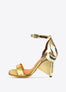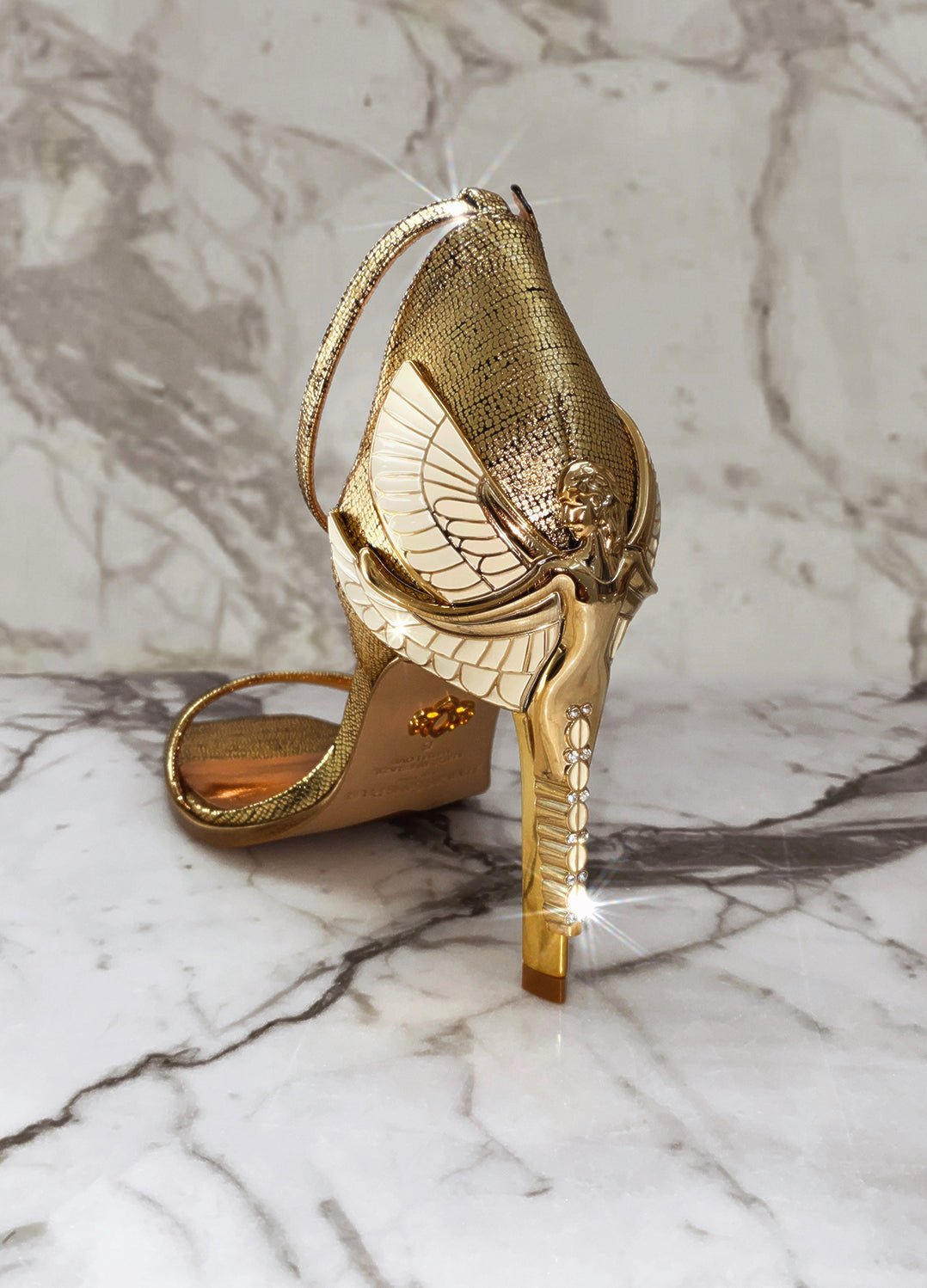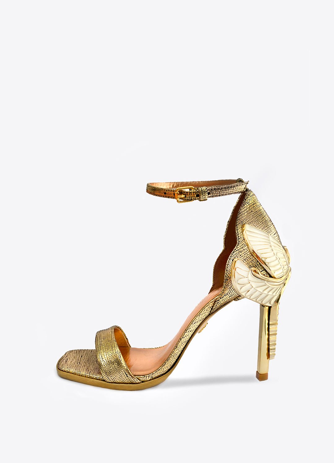 Have all heads turning in our golden lizard effect Aurora Sandals! Perfect for our brides or fabulous holiday heels. Inspired by our love for Art Nouveau and ancient Egyptian jewelry, our Dragonfly Queen's expansive wings will empower your mindset and awaken your soles in these Dark Gold lizard effect high heel leather sandals. Swarovski crystals are inset in her tail so you will be glittering with every step. They are truly jewelry for your feet! There is a rubber pod recessed into the sole to help prevent slipping on the go.