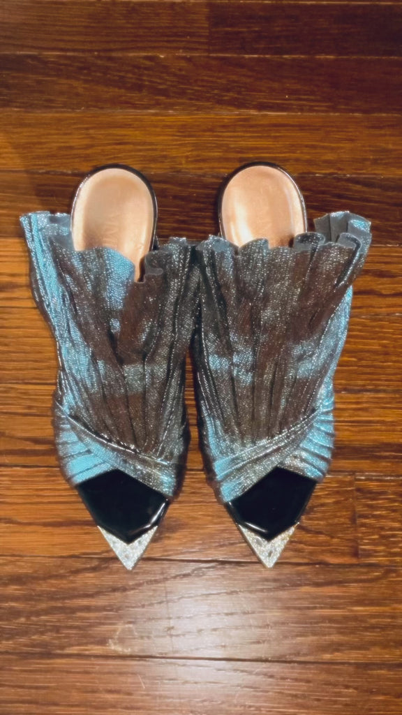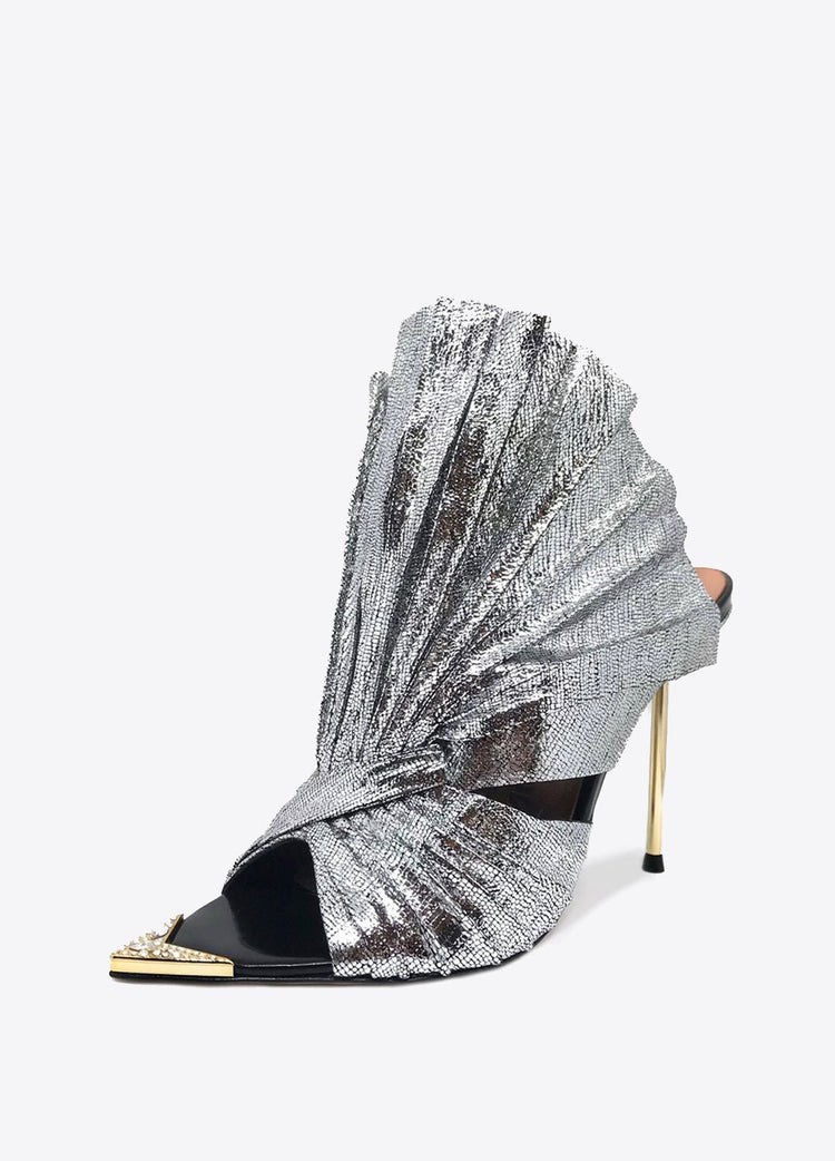 Pleated Silver metallic lizard leather is sculpted to create a scalloped fan effect, setting the perfect stage for the wearer to walk with conviction in this all heads turning mule. The metal toe rand features inlaid Swarovski crystals that will have her glittering with every step. A rubber pod recessed into the sole helps prevent slipping on the go.
