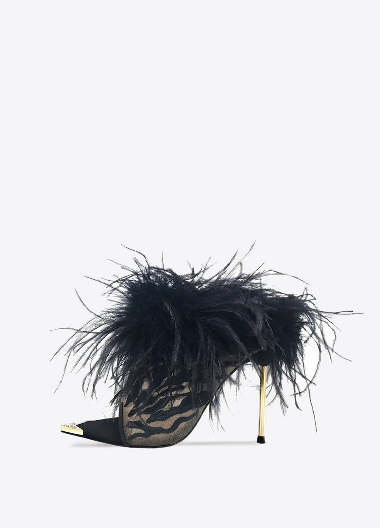 Stand out from the crowd in this show stopping stunner! Barely there mesh is detailed with rich embroidery in a seductive tiger pattern with a luxurious black plume of feathers playfully cascading around the ankle. The toe features a metal rand with glittering Swarovski crystals. A rubber pod recessed into the sole to helps prevent slips on the go.