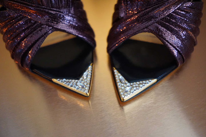 Pleated Silver metallic lizard leather is sculpted to create a scalloped fan effect, setting the perfect stage for the wearer to walk with conviction in this all heads turning mule. The metal toe rand features inlaid Swarovski crystals that will have her glittering with every step. A rubber pod recessed into the sole helps prevent slipping on the go.