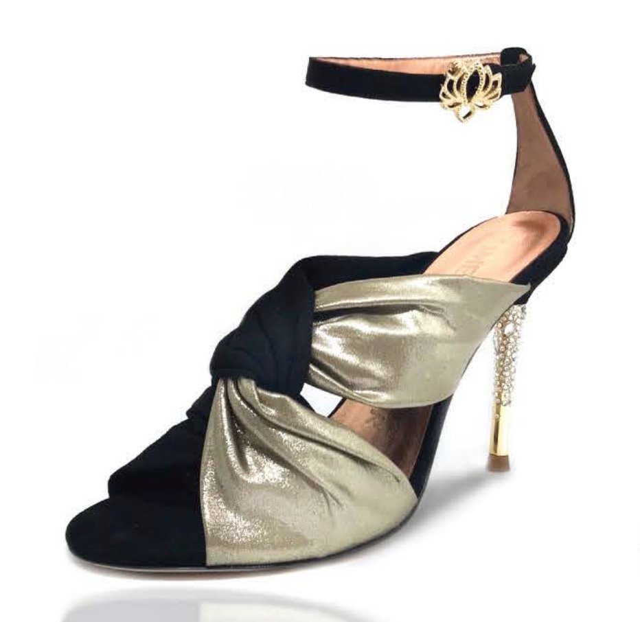 Glittering like diamonds at dusk, Swarovski crystals adorn this precious heel. A criss-cross silk & kid suede straps lay delicately across the foot. Our signature lotus flower ornament acts ass as elegant jewelry. These sandals are perfect for an evening out. There is also a rubber pod recessed into the sole to help prevent slipping on the go.